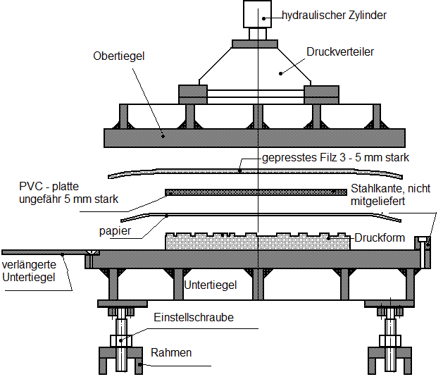 Feste Untertiegel und elektrisch angetriebene Hydraulikpumpe Das Bild oben zeigt einen Teil des VPLEV-80x100. Diese Anleitung ist nur für die Verwendung der Tiegel bestimmt, was fast der Verwendung des SVP-35 entspricht. Alle weiteren Anweisungen finden Sie auf anderen spezifischen Seiten, von denen die Anweisungen des Benutzers für das Dreiwegeventil am wichtigsten sind. Fast alles kann als Druckform verwendet werden; Bleisorte, Holzschnitt, Linolschnitt, Klischee usw. Das Papier wird auf die eingefärbte Form gelegt. Darüber eine PVC-Platte von ca. 5 mm dick und eine Filzschicht wird aufgelegt. Auf dem Bild ist eine Stahlkante dargestellt, die mit Schrauben an der unteren Platte befestigt ist. Diese Kanten werden normalerweise nicht von Polymetaal bereitgestellt. Diese Kanten sind nützlich, wenn eine Form gesichert werden muss (Holzschnitte + Typografie usw.). Wir können sie auf Anfrage liefern. Eine Druckform ist nicht perfekt flach. Wenn Sie eine solche Form ausdrucken, wird angezeigt, dass einige Teile mehr Tinte enthalten als andere. Der Filz gleicht kleine Abweichungen in der Form aus. Der Filz darf das Papier jedoch niemals direkt berühren, da dies dazu führen kann, dass die Tinte von den unteren Teilen der Form auf das Papier übertragen wird. Um dies zu vermeiden, wird eine 5 mm dicke PVC-Schicht zwischen Papier und Filz gelegt. PVC ist flexibel genug, um sich an Abweichungen in der Form anzupassen, vermeidet jedoch gleichzeitig, dass das Papier die Vertiefungen in der Form berührt. NORMEN Der Hersteller dieser Produkte: Polymetaal erklärt, dass dieses Gerät der europäischen Norm IEC 335-I "Sicherheit elektrischer Geräte für den Hausgebrauch und ähnliche Zwecke" entspricht und gemäß der CE-Norm (Richtlinien für Maschinen und magnetische Verträglichkeit) hergestellt wurde; und tragen die Kennzeichnung "CE". Instandhaltung: