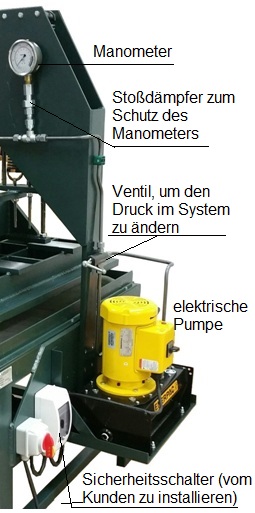 - Der richtige Druck sollte in einer Probesitzung ermittelt werden. Das Überströmventil muss dann so eingestellt werden, dass es bei Erreichen des gewünschten Drucks überläuft.