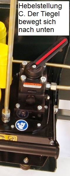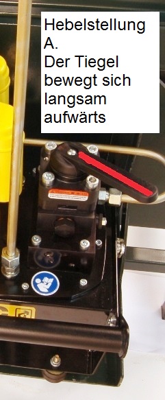 - Wenn die Platte wieder nach oben kommen muss, drehen Sie das Ventil langsam in Position A. Dies muss langsam erfolgen, insbesondere wenn hohe Drücke auftreten. Eine plötzliche Druckentlastung erzeugt einen "Schock" im System. Dies ist in keiner Weise gefährlich, es ist nur unangenehm. (Das Manometer ist mit Öl gefüllt, um den Dämpfer in seinem Mechanismus zu neutralisieren.)