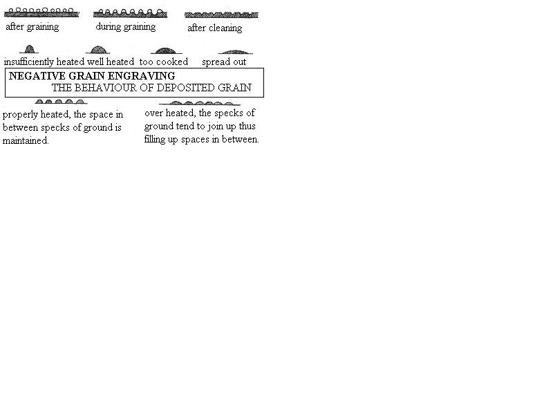 B. GRAINING THE PLATE. The purpose of graining is to protect the plate during the biting process in such a way that the biting forms a series of little hollows. The parts of the plate not protected by the grain will be bitten by the mordant. Hence it should be quite obvious that the quality and degree of the grain depend on the graining. When graining the artist must keep in mind that the goal of his work is to create areas that are pockmarked with holes of varying depth which will retain ink. Therefore the roughness, the spacing, and the depth of the grainy texture should be in function of the desired result. Values can be obtained by superimposing layers of grain, in a selective manner, as if one were repeating the graining. As was the case in positive and negative drawing there are positive and negative grains.