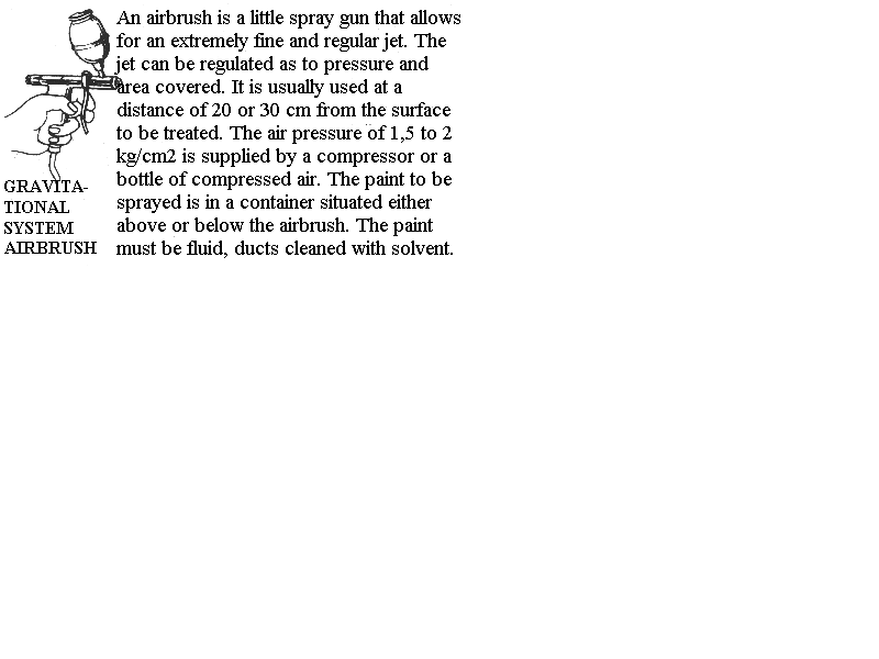 - GRAINING WITH AN AIRBRUSH. Unlike the graining methods described above, which only allow for regular and solid colour grains, the specific technique I have developed for graining with an airbrush produces subtle nuances. For example, by using an airbrush one can obtain a heavily grained top of the plate and a lightly grained bottom with a progessive fade* between these two extremes. Furthermore, an airbrush grain can be extremely fine and can mix with the half-tones of a drawing in one operation. The only difficulty is the installation of the equipment needed. The airbrush itself is a little spray gun which is usually reasonably priced but it needs a supply of compressed air or a compressor. The artist must decide whether to use bottles of compressed air or a compressor. A full description of the airbrush* will be found in A treatise on Aquatint.