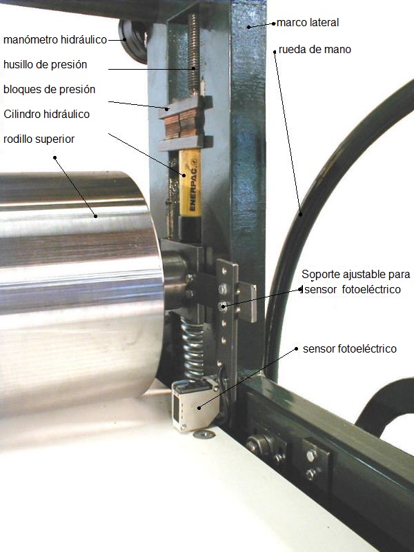 Esta imagen muestra el sensor fotoeléctrico que protege el rodillo superior en ambos lados. El reflector en el otro lado de la prensa refleja el haz de luz infrarroja. Si este haz de luz es interrumpido por algo, la prensa se detendrá automáticamente. El rodillo superior incluso girará hacia atrás un momento corto. |