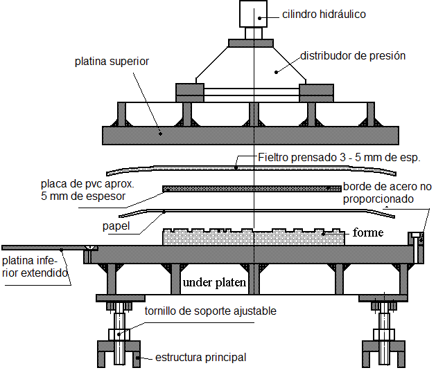 Platina inferior fija y bomba hidráulica accionada manualmente. La imagen de arriba muestra una parte del VPLMV-80x100. Estas instrucciones solo están destinadas al uso de las placas, que es casi lo mismo que el uso del SVP-35. Esta prensa está equipada con una bomba hidráulica accionada manualmente. Si la palanca de esta bomba se mueve hacia arriba y hacia abajo (válvula de alivio cerrada), la platina superior se moverá hacia abajo. Esto sucede relativamente rápido, porque la bomba desplaza un gran volumen de aceite a baja presión. Tan pronto como la platina toca la forma, la presión en el sistema aumenta y la bomba cambiará automáticamente al modo de alta presión (700 bar). En este modo, el movimiento vertical de la platina superior es muy lento. Tan pronto como se haya realizado la impresión, la válvula de alivio se abre y la platina superior se mueve hacia arriba. El movimiento vertical está limitado a aproximadamente 14 cm. Para aumentar la velocidad de trabajo, es aconsejable detener el movimiento vertical después de unos pocos centímetros. Para ello, se montan dos barras roscadas junto al cilindro hidráulico. Estas barras se pueden ajustar en altura y sirven como tope para el movimiento vertical de la platina superior. Casi cualquier cosa puede ser utilizada como una forma de impresión; Compuesto por letras plomadas, xilografía, lino-corte, cliché, etc. El papel se coloca sobre la forma de tinta. En la parte superior del papel una placa de PVC de aprox. Se coloca un grosor de 5 mm, y encima de eso una capa de fieltro. En la imagen se muestra un borde de acero, fijado con tornillos en la platina inferior. Estos bordes normalmente no son proporcionados por Polymetaal. Estos bordes son útiles si una forma tiene que estar cerrada. (Grabados en madera + tipografía, etc.). Podemos suministrarlos bajo demanda. Ninguna forma es perfectamente plana. Si hace una impresión de tal forma, se muestra que algunas partes recibieron la tinta más que otras. El fieltro compensa las pequeñas desviaciones en la forma. Sin embargo, el fieltro nunca puede tocar el papel directamente porque puede conducir a una transferencia de la tinta al papel desde las partes inferiores de la forma. Para evitar que esto suceda, se coloca una capa de PVC de 5 mm de espesor entre el papel y el fieltro. El PVC es lo suficientemente flexible como para adaptarse a las desviaciones en la forma, pero se evita al mismo tiempo que el papel toca los huecos en la forma. Mantenimiento: