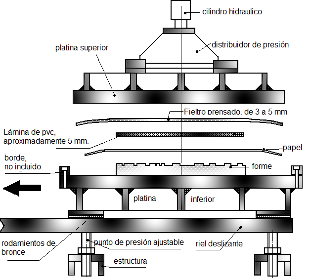 Platina inferior movible y bomba hidráulica de accionamiento eléctrico. La imagen de arriba muestra una parte del VPLER-80x100. Estas instrucciones solo están destinadas al uso de los platos, que es casi el mismo que el uso del SVP-35. Todas las demás instrucciones se pueden encontrar en otras páginas específicas, de las cuales las instrucciones del usuario para la válvula de tres vías son las más importantes. Casi cualquier cosa puede ser utilizada como un formulario de impresión; Tipo de plomo, grabado en madera, corte de lino, cliché, etc. El papel se coloca sobre la forma de tinta. Además de eso, una placa de PVC de aprox. 5 mm de espesor y se coloca una capa de fieltro. En la imagen se muestra un borde de acero, fijado con tornillos en la platina inferior. Estos bordes normalmente no son proporcionados por Polymetaal. Estos bordes son útiles si una forma tiene que estar cerrada. (Grabados en madera + tipografía, etc.). Podemos suministrarlos bajo demanda. Una forma de impresión no es perfectamente plana. Si hace una impresión de tal forma, muestra que algunas partes muestran más tinta que otras partes. El fieltro compensa las pequeñas desviaciones en la forma. Sin embargo, el fieltro nunca puede tocar el papel directamente porque puede conducir a una transferencia de la tinta al papel desde las partes inferiores de la forma. Para evitar que esto suceda, se coloca una capa de PVC de 5 mm de espesor entre el papel y el fieltro. El PVC es lo suficientemente flexible como para adaptarse a las desviaciones en la forma, pero se evita al mismo tiempo que el papel toca los huecos en la forma. NORMAS El fabricante de estos productos: Polymetaal declara que este equipo cumple con la norma europea IEC 335-I "Seguridad de las aplicaciones eléctricas domésticas y similares" y se produce de acuerdo con la norma CE (Directrices para maquinaria y compatibilidad magnética); y llevar el marcado "CE". Mantenimiento: