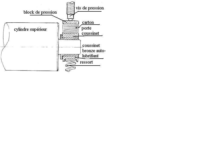 N.B. La fonction du feutre est de presser le papier dans les creux (creé par l'acide ou burin) jusqu'à l'encre, pour que le papier puisse "boire" l'encre. Certaines personnes utilisent une épaisseur de carton ou de cuir sous les vis de pression our avoir plus de "souplesse" d'utilisation. Pour les tirages en creux, ça n'a pas d'effet, mais pour les tirages en relief cela sera utile; une planche ou lino ne sont jamais complètement plane, c'est pourquoi le depot de l'encre sur le papier n'est jamais partout le même. Si le cylindre supérieur a cette souplesse, cela permet de corriger un peu les irrégularitées de la surface de la planche ou lino.