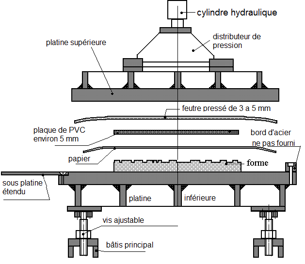 Plateau inférieur fixe et pompe hydraulique à commande manuelle. L'image ci-dessus montre une partie de la VPLMV-80x100. Ces instructions sont uniquement destinées à l’utilisation des plateaux, ce qui est presque identique à l’utilisation de la SVP-35. Cette presse est équipée d'une pompe hydraulique à commande manuelle. Si le levier de cette pompe est déplacé vers le haut et le bas (soupape de décharge fermée), le plateau supérieur se déplacera vers le bas. Cela se produit assez rapidement, car la pompe déplace un grand volume d'huile à basse pression. Dès que la platine touche la forme, la pression dans le système augmente et la pompe passe automatiquement en mode haute pression (700 bars). Dans ce mode, le mouvement vertical du plateau supérieur est très lent. Dès que l'impression est faite, la soupape de décharge s'ouvre et le plateau supérieur se déplace vers le haut. Le mouvement vertical est limité à environ 14 cm. Pour augmenter la vitesse de travail, il est conseillé d'arrêter le mouvement vertical après quelques centimètres. A cet effet, deux barres filetées sont montées à côté du cylindre hydraulique. Ces barres peuvent être réglées en hauteur et servent de butée pour le mouvement vertical de la platine supérieure. Presque tout peut être utilisé comme une forme d'impression; charactères composées au plomb, gravure sur bois, lino-gravure, cliché, etc. Le papier est déposé sur la forme encrée. Sur le papier, une plaque de PVC d'env. une épaisseur de 5 mm est appliquée et une couche de feutre est ajoutée. Sur l'image, un bord en acier est montré, fixé avec des vis sur le plateau inférieur. Ces bords ne sont normalement pas fournis par Polymetaal. Ces bords sont utiles si une forme doit être verrouillée. (Gravures sur bois + typographie, etc.). Nous pouvons les fournir à la demande. Aucune forme n'est parfaitement plane. Si vous imprimez une telle forme, cela montre que certaines parties ont reçu plus d'encre que d'autres. Le feutre compense les petites déviations dans la forme. Cependant, le feutre ne peut jamais toucher le papier directement car cela peut entraîner un transfert de l'encre sur le papier à partir des parties inférieures de la forme. Afin d'éviter cela, une couche de PVC de 5 mm d'épaisseur est placée entre le papier et le feutre. Le PVC est suffisamment souple pour s’adapter aux déviations de la forme, mais évite en même temps que le papier touche les creux de la forme. Entretien: