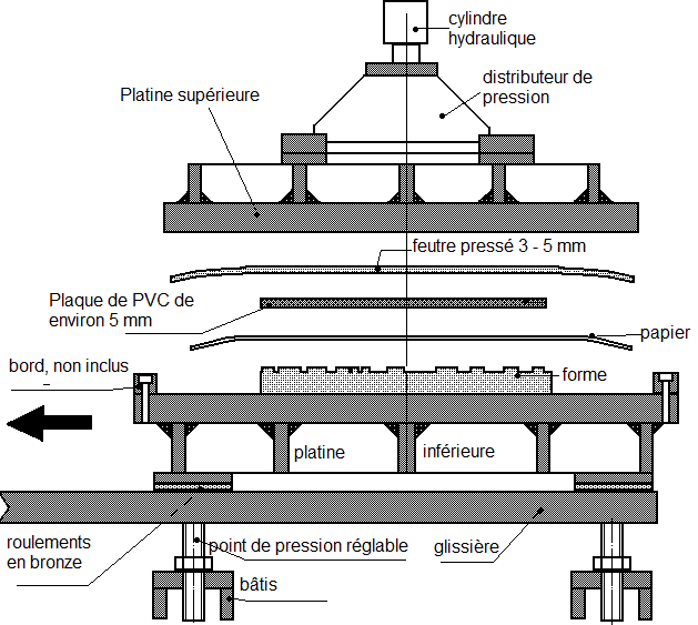 Plateau inférieur mobile et pompe hydraulique à commande manuelle. L'image ci-dessus montre une partie de la VPLMR-80x100. Ces instructions sont uniquement destinées à l’utilisation des plateaux, ce qui est presque identique à l’utilisation de la SVP-35. Cette presse est équipée d'une pompe hydraulique à commande manuelle. Si le levier de cette pompe est déplacé vers le haut et le bas (soupape de décharge fermée), le plateau supérieur se déplacera vers le bas. Cela se produit assez rapidement, car la pompe déplace un grand volume d'huile à basse pression. Dès que la platine touche la forme, la pression dans le système augmente et la pompe passe automatiquement en mode haute pression (700 bars). Dans ce mode, le mouvement vertical du plateau supérieur est très lent. Dès que l'impression est faite, la soupape de décharge s'ouvre et le plateau supérieur se déplace vers le haut. Le mouvement vertical est limité à environ 14 cm. Pour augmenter la vitesse de travail, il est conseillé d'arrêter le mouvement vertical après quelques centimètres. A cet effet, deux barres filetées sont montées à côté du cylindre hydraulique. Ces barres peuvent être réglées en hauteur et servent de butée pour le mouvement vertical de la platine supérieure. Presque tout peut être utilisé comme une forme d'impression; charactères composées au plomb, gravure sur bois, lino-gravure, cliché, etc. Le papier est déposé sur la forme encrée. Sur le papier, une plaque de PVC d'env. une épaisseur de 5 mm est appliquée et une couche de feutre est ajoutée. Sur l'image, un bord en acier est montré, fixé avec des vis sur le plateau inférieur. Ces bords ne sont normalement pas fournis par Polymetaal. Ces bords sont utiles si une forme doit être verrouillée. (Gravures sur bois + typographie, etc.). Nous pouvons les fournir à la demande. Aucune forme n'est parfaitement plane. Si vous imprimez une telle forme, cela montre que certaines parties ont reçu plus d'encre que d'autres. Le feutre compense les petites déviations dans la forme. Cependant, le feutre ne peut jamais toucher le papier directement car cela peut entraîner un transfert de l'encre sur le papier à partir des parties inférieures de la forme. Afin d'éviter cela, une couche de PVC de 5 mm d'épaisseur est placée entre le papier et le feutre. Le PVC est suffisamment souple pour s’adapter aux déviations de la forme, mais évite en même temps que le papier touche les creux de la forme. Entretien: