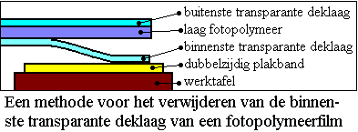 De film bestaat uit drie lager: een transparante plastic folie, zowel aan de buitenkant als aan de binnenkant, met de fotopolymeerlaag er tussen. De film is op rol aangeleverd. De binnenste laag is die laag die aan de binnenkant van de "krul" zit. |
